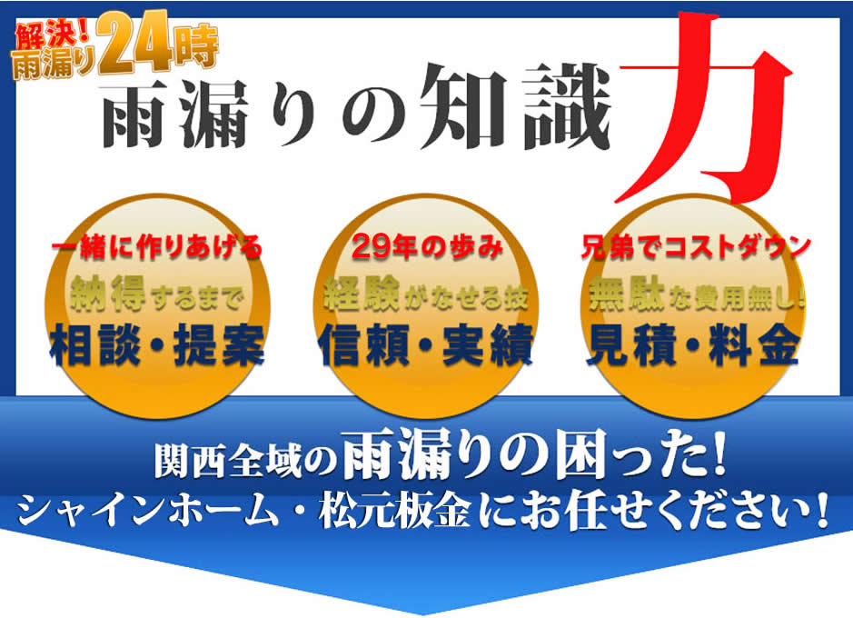 創業23年。関西全域の様々な場所で屋根リフォーム、雨漏り補修を中心に営業してまいりました。正しい情報を正確に隠し事せずにお客様にお伝えする事・スタッフ間で毎日話し合い、向上心を持って努力を惜しまず取り組んでまいりました。その結果、多くのお客様から信頼を得て、関西全域で数多くの実績を積んでまいりました。